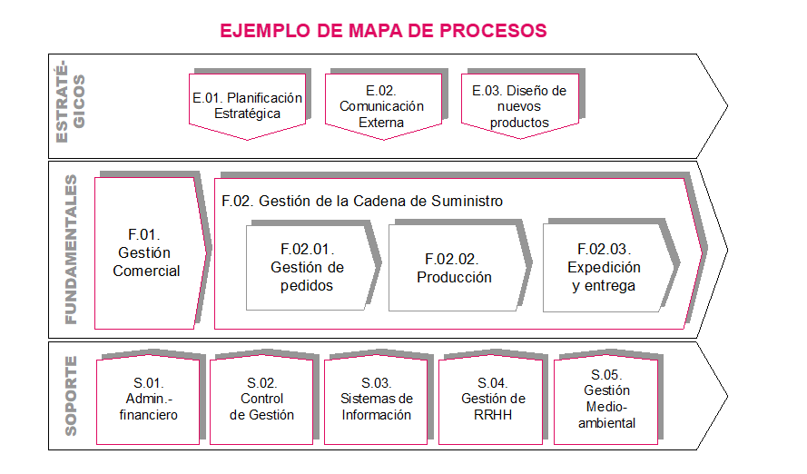 Un Mapa de Procesos constituye una visión integrada de alto nivel del conjunto de la empresa desde una óptica estratégica y operativa a la vez. Cada proceso del Modelo puede a su vez desglosarse en Subprocesos.